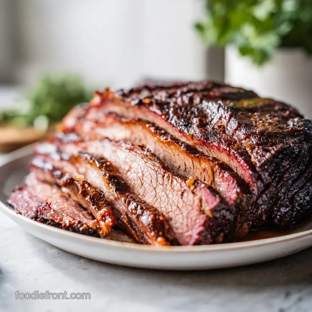 Fanning the slices out and drizzling a little of those resting juices over the top makes it look like it came straight from a professional BBQ joint. If you have some fresh parsley or chives, a quick sprinkle adds a pop of color that breaks up the deep mahogany of the bark.